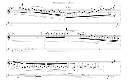 After the Flood is an excerpt from Turning Two Hundred — a 50-min work for orchestra, jazz band, soloists, electronic music, video, and dance, commissioned by Ohio University to commemorate its bicentennial. Before the Army Corps of Engineers were called in to reroute the river in 1969, floods routinely inundated Ohio University. It wasn’t so much a question of if, but when and how deep. The purely electronic introduction is subtitled Springtime on the Hocking. The duet itself is entitled After the Flood, though a more accurate but completely unwieldy title would be “After the Storms Have Ended and Floods Have Arrived, But Before the Waters Have Receded.”