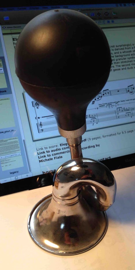 Elegy and Honk, for English horn and electro-acoustic music, is (not surprisingly) a work in two highly contrasting movements. The entire accompaniment to the Elegy is derived from a few English horn sounds — short notes in various registers, some “airy” key clicks, and a whoosh of air rushing through the instrument without the reed in place. The dense clouds in the background actually come from a single very short English horn “blip” subjected to a process called granular synthesis, through which the original audio is exploded into tiny fragments. Each fragment is then stretched nearly to the breaking point and recombined into several layers of overlapping texture. The second movement employs an expanded palette of source material including a menagerie of geese and duck sounds, joined by an old-fashioned bicycle horn — Honk, indeed! — M.P.